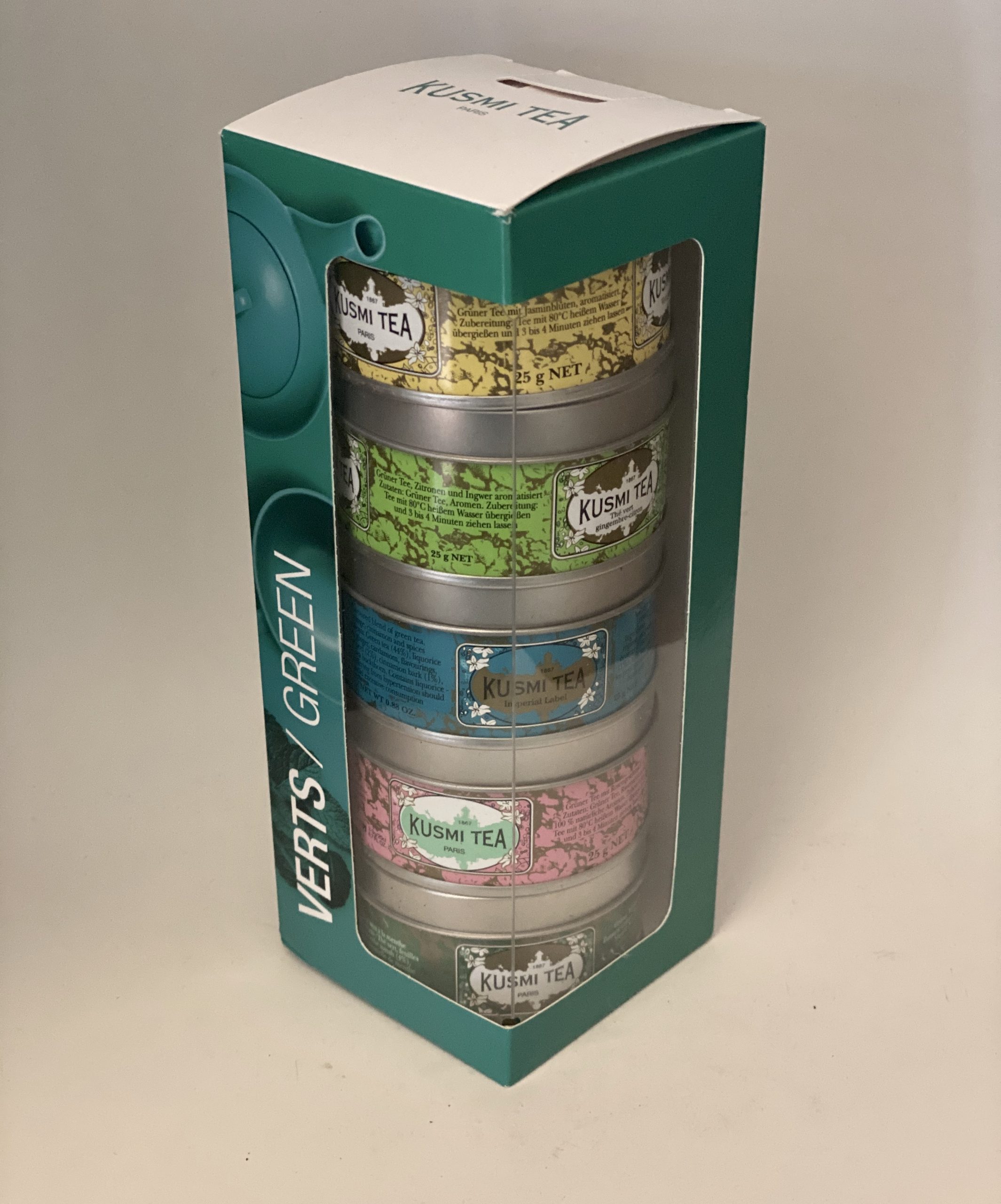 Le Coffret de thé Les Verts est un assortiment de 5 miniatures à base de thés verts, idéal pour découvrir ou faire découvrir les thés verts de la maison. Le thé vert parfumé au Jasmin ravira les amateurs de parfums floraux et le thé vert saveur gingembre-citron sera apprécié pour ses notes acidulées et légèrement épicées. Label Impérial apportera de la gourmandise avec son subtil mélange d’orange, de cannelle et de réglisse. Le thé vert saveur rose révèlera quant à lui son parfum délicat, tandis que le thé vert à la menthe proposera une expérience rafraîchissante.