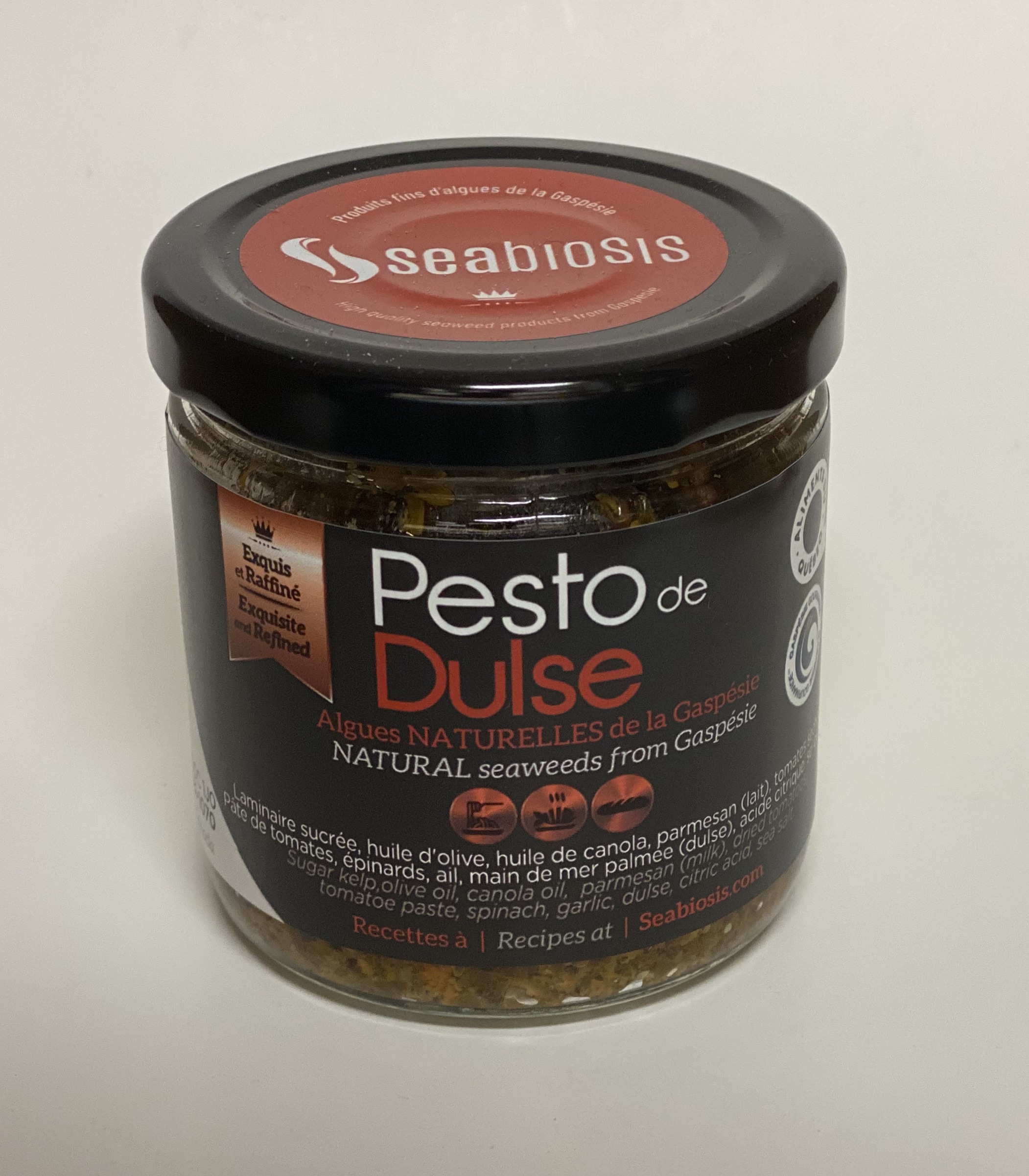 Algues naturelles de la Gaspésie. Ingrédients: Laminaire sucrée, huile d’olive, huile de canola, parmesan (lait), tomates séchées,pâte de tomates, épinards, ail, main de mer palmée (dulse), acide citrique, sel de mer.
